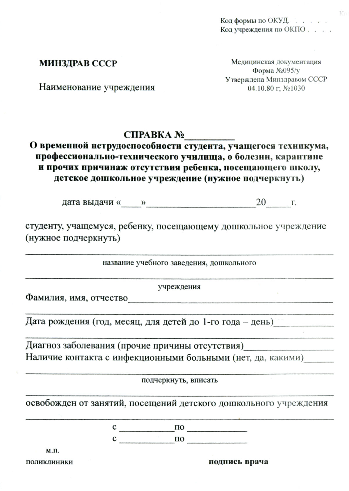 Справка 095/у, подтверждая временную нетрудоспособность своего владельца по состоянию здоровья, как раз и является таким оправдательным документом. Максимальный срок её действия может достигать 14 дней, но при наличии показаний врач имеет право продлить его ещё на две недели.
